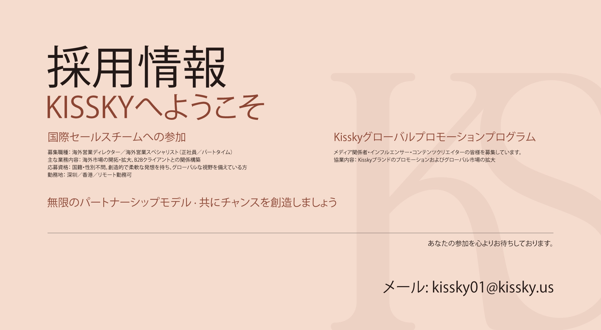 Kisskyでは、快感はラグジュアリーでエレガント、そして国境を越えるべきだと考えています。ブランドが世界中に拡大する中で、情熱的で才能ある個人を私たちの旅に迎えたいと考えています。営業プロフェッショナル、メディアクリエイター、インフルエンサーなど、Kisskyではあなたが共に成長し、グローバル市場で影響を与えるチャンスがあります。 国際営業チーム募集 現在、以下のポジションを募集しています: 仕…
